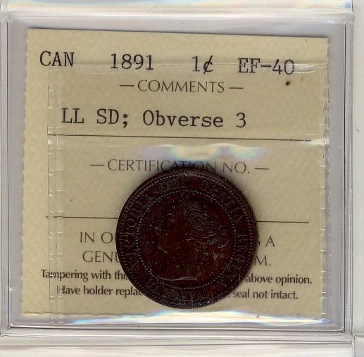 1891 1¢ LL SD Obv 3, ICCS EF40.