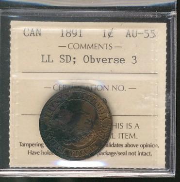 1891 1¢ LL SD Obv3 ICCS AU55.