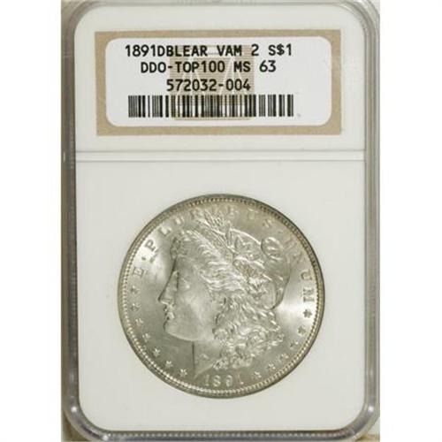 <B>1891 $1 Doubled Die Obverse, Double Ear MS63 NGC.</B></I> VAM-2B. A Top 100 Variety. NGC Census: (1527/1012). PCGS Population (2143/1396). Mintage: 8,694,206. Numismedia Wsl. Price for NGC/PCGS coin in MS63: $144. (#7204)<BR><BR><B>Coin Engraver:</B> George T. Morgan<BR><BR><b>Shipping:</b> Coins & Currency (<a target="_blank" href="http://www.heritageauctions.com/common/shipping.php">view shipping information</a>)