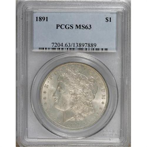 <B>1891 $1 MS63 PCGS.</B></I> PCGS Population (2054/1247). NGC Census: (1471/981). Mintage: 8,694,206. Numismedia Wsl. Price for NGC/PCGS coin in MS63: $144. (#7204)<BR><BR><B>Coin Engraver:</B> George T. Morgan<BR><BR><b>Shipping:</b> Coins & Currency (<a target="_blank" href="http://www.heritageauctions.com/common/shipping.php">view shipping information</a>\)