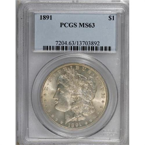<B>1891 $1 MS63 PCGS.</B></I> PCGS Population (2104/1318). NGC Census: (1490/990). Mintage: 8,694,206. Numismedia Wsl. Price for NGC/PCGS coin in MS63: $144. (#7204)<BR><BR><B>Coin Engraver:</B> George T. Morgan<BR><BR><b>Shipping:</b> Coins & Currency (<a target="_blank" href="http://www.heritageauctions.com/common/shipping.php">view shipping information</a>)