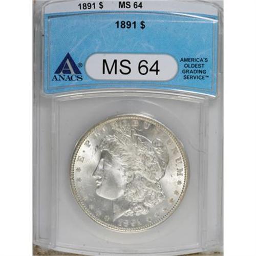 <B>1891 $1 MS64 ANACS.</B></I> NGC Census: (919/67). PCGS Population (1189/83). Mintage: 8,694,206. Numismedia Wsl. Price for NGC/PCGS coin in MS64: $500. (#7204)<BR><BR><B>Coin Engraver:</B> George T. Morgan<BR><BR><b>Shipping:</b> Coins & Currency (<a target="_blank" href="http://www.heritageauctions.com/common/shipping.php">view shipping information</a>\)
