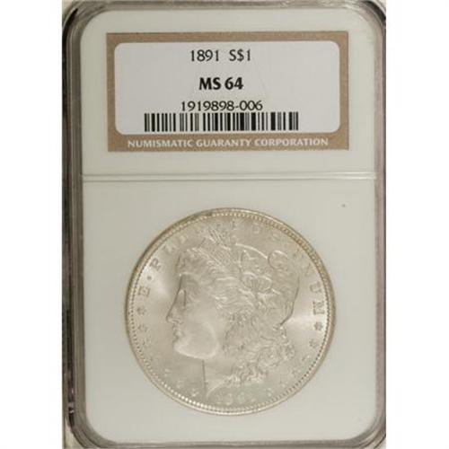 <B>1891 $1 MS64 NGC.</B></I> NGC Census: (914/67). PCGS Population (1165/82). Mintage: 8,694,206. Numismedia Wsl. Price for NGC/PCGS coin in MS64: $500. (#7204)<BR><BR><b>Shipping:</b> Coins & Currency (<a target="_blank" href="http://www.heritageauctions.com/common/shipping.php">view shipping information</a>)