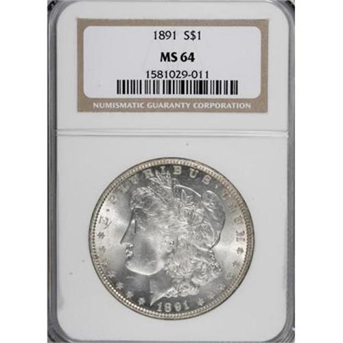 <B>1891 $1 MS64 NGC.</B></I> NGC Census: (923/67). PCGS Population (1210/85). Mintage: 8,694,206. Numismedia Wsl. Price for NGC/PCGS coin in MS64: $500. (#7204)<BR><BR><B>Coin Engraver:</B> George T. Morgan<BR><BR><b>Shipping:</b> Coins & Currency (<a target="_blank" href="http://www.heritageauctions.com/common/shipping.php">view shipping information</a>)