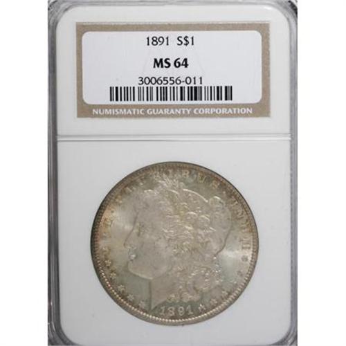 <B>1891 $1 MS64 NGC.</B></I> NGC Census: (933/74). PCGS Population (1303/88). Mintage: 8,694,206. Numismedia Wsl. Price for NGC/PCGS coin in MS64: $480. (#7204)<BR><BR><B>Coin Engraver:</B> George T. Morgan<BR><BR><b>Shipping:</b> Coins & Currency (<a target="_blank" href="http://www.heritageauctions.com/common/shipping.php">view shipping information</a>)