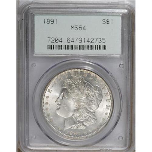 <B>1891 $1 MS64 PCGS.</B></I> PCGS Population (1210/85). NGC Census: (923/67). Mintage: 8,694,206. Numismedia Wsl. Price for NGC/PCGS coin in MS64: $500. (#7204)<BR><BR><B>Coin Engraver:</B> George T. Morgan<BR><BR><b>Shipping:</b> Coins & Currency (<a target="_blank" href="http://www.heritageauctions.com/common/shipping.php">view shipping information</a>)