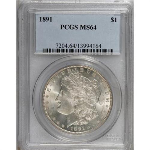 <B>1891 $1 MS64 PCGS.</B></I> Softly struck over the centers, and on the details of the wreath bow on the lower reverse, this untoned near-Gem is otherwise well defined and free of any severe bagmarks. A few minor distractions are noted, including a shallow streak that diagonally bisects the obverse from near 2 o'clock to approximately 8 o'clock on the border. <BR><BR><B>Coin Engraver:</B> George T. Morgan<BR><BR><b>Shipping:</b> Coins & Currency (<a target="_blank" href="http://www.heritageauctions.com/common/shipping.php">view shipping information</a>)