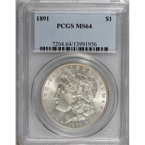 <B>1891 $1 MS64 PCGS.</B></I> The surfaces of this near-Gem are somewhat grainy, especially in the peripheral fields. Both sides possess strong luster, which on most examples is unsatisfactory. Weakly struck in the central areas, again typical for the date. A few minor handling marks are noted on the obverse.<BR><BR><B>Coin Engraver:</B> George T. Morgan<BR><BR><b>Shipping:</b> Coins & Currency (<a target="_blank" href="http://www.heritageauctions.com/common/shipping.php">view shipping information</a>)