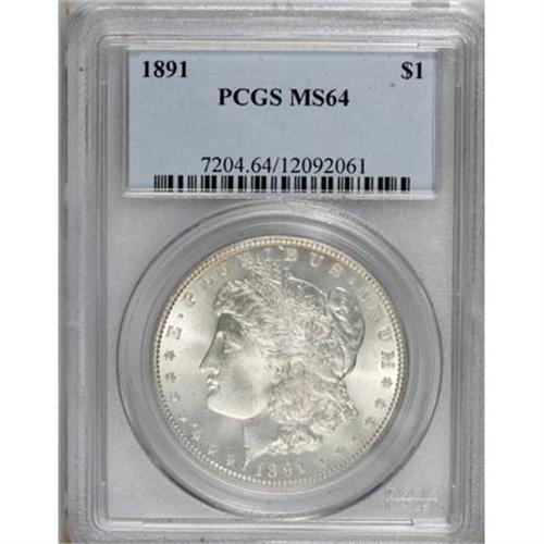 <B>1891 $1 MS64 PCGS.</B></I> Well struck with impressively clean surfaces for the grade and pleasing, creamy luster. Essentially untoned on both sides. This issue becomes conditionally scarce at the Gem level of preservation. <BR><BR><B>Coin Engraver:</B> George T. Morgan<BR><BR><b>Shipping:</b> Coins & Currency (<a target="_blank" href="http://www.heritageauctions.com/common/shipping.php">view shipping information</a>)