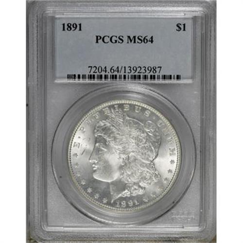 <B>1891 $1 MS64 PCGS.</B></I> Boldly struck with pleasing luster across both sides, and untoned silver-gray surfaces that are nicely preserved. A few minor blemishes are noted on Liberty's cheek, and in the left obverse field. <BR><BR><B>Coin Engraver:</B> George T. Morgan<BR><BR><b>Shipping:</b> Coins & Currency (<a target="_blank" href="http://www.heritageauctions.com/common/shipping.php">view shipping information</a>)