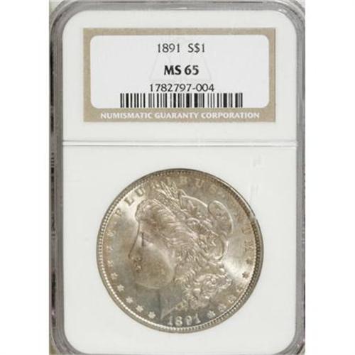 <B>1891 $1 MS65 NGC.</B></I> A perusal of the NGC and PCGS population figures reveals that Mint State 1891 dollars are abundant throughout the MS64 grade level, but the numbers fall precipitously in MS65 (specifically, from about 2,100 near-Gems to 145 MS65 pieces, and five specimens finer). A medley of soft golden-tan, violet, and powder-blue patina exhibits slightly deeper hues on the obverse, and glowing luster emanates from both sides. The design elements are well defined, and well preserved surfaces have a grainy finish, which is typical for the issue. Great overall eye appeal! Census: 67 in 65, 2 finer (12/07).<BR><BR><B>Coin Engraver:</B> George T. Morgan<BR><BR><b>Shipping:</b> Coins & Currency (<a target="_blank" href="http://www.heritageauctions.com/common/shipping.php">view shipping information</a>)