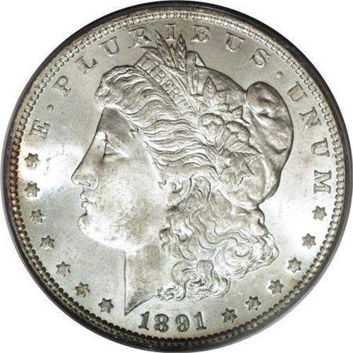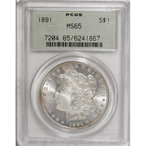 <B>1891 $1 MS65 PCGS.</B></I> Well struck and essentially untoned, save for a bit of reddish color near the left obverse border at 9 o'clock, this visually impressive Gem exhibits dynamic cartwheel luster in the fields. There are a few wispy field marks on each side, but these are not excessive for the grade. Housed in a green label holder. Population: 85 in 65, 3 finer (12/07).<BR><BR><B>Coin Engraver:</B> George T. Morgan<BR><BR><b>Shipping:</b> Coins & Currency (<a target="_blank" href="http://www.heritageauctions.com/common/shipping.php">view shipping information</a>)