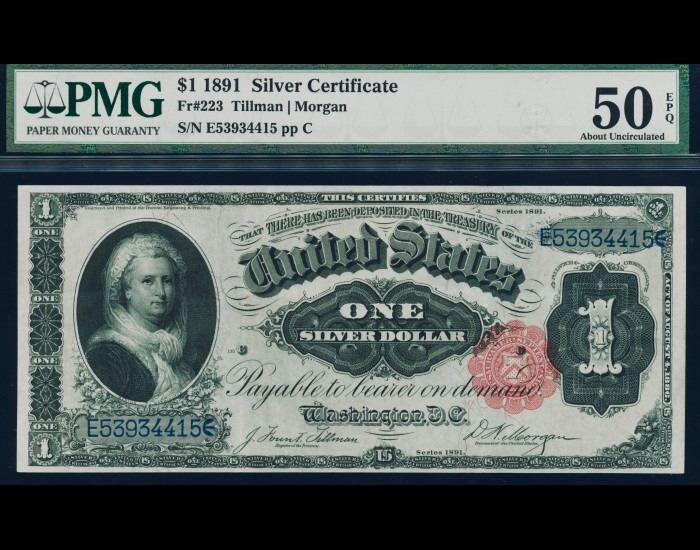 One 1891 $1 Martha Washington Silver Cert PMG 50EPQ.
