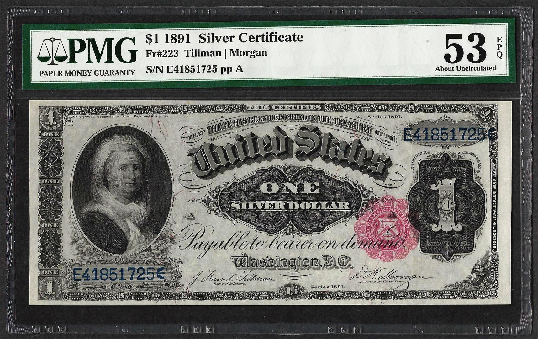 One 1891 $1 Martha Washington Silver Certificate Note Fr.223 PMG About Uncirculated 53EPQ. PMG Certified.