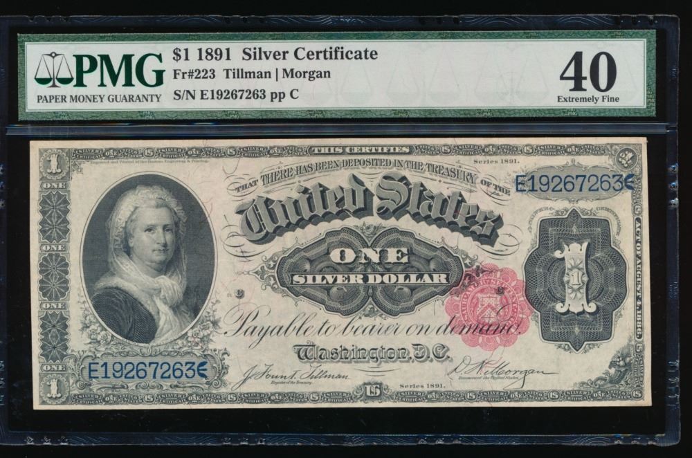 One 1891 $1 Martha Washington Silver Certificate PMG 40.