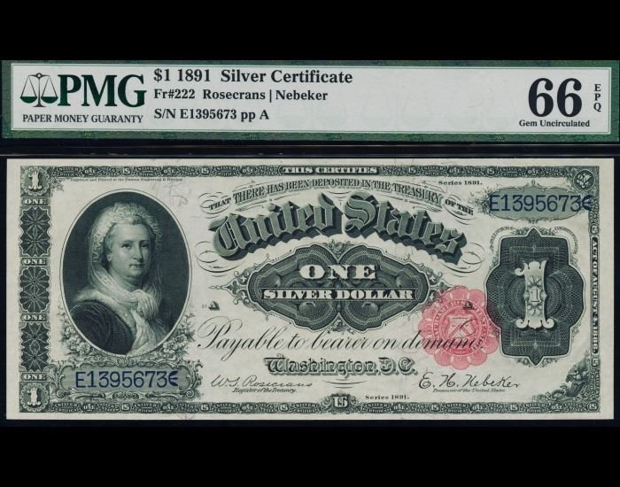 One 1891 $1 Martha Washington Silver Certificate PMG 66EPQ.