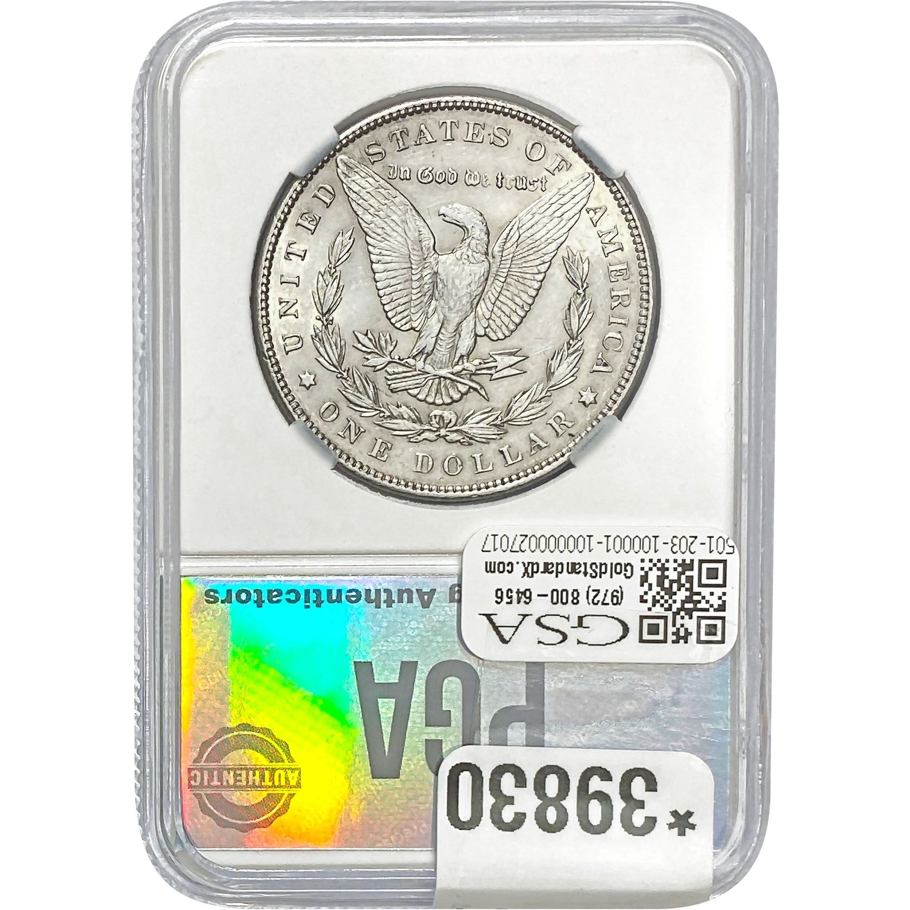 COINS AND CURRENCY LISTED IN GSA’S CATALOG AS GRADED AND ENCAPSULATED BY PCGS, NGC, ANACS, ICG, PCGS CURRENCY, PMG, PCGS BANKNOTE GRADING, CMC OR ANY OTHER THIRD-PARTY GRADING SERVICE ARE LIKEWISE SOLD “AS-IS” EXCEPT AS EXPRESSLY SET FORTH HEREIN. ALL THIRD-PARTY GRADING SERVICE GUARANTEES, INCLUDING AUTHENTICITY, ARE THE SOLE RESPONSIBILITY OF THE THIRD-PARTY GRADING SERVICE AND NOT WARRANTIES OR GUARANTEES OF GSA. BIDDERS SHOULD CONTACT THESE THIRD-PARTY GRADING SERVICES DIRECTLY WITH RESPECT TO ANY CLAIMS OR QUESTIONS THEY MAY HAVE CONCERNING THEIR GUARANTEES AND WARRANTIES. BIDDERS ACKNOWLEDGE AND AGREE THAT AUCTIONEER IS NOT BOUND BY OR LIABLE FOR ANY OPINION OR CERTIFICATION BY ANY THIRD-PARTY GRADING SERVICE. REMOVAL OF A PRODUCT FROM ITS PROTECTIVE CASING OR HOLDER OR ALTERATION OF ANY COIN HOLDER WAIVES ALL RIGHTS CONCERNING THE PRODUCT CONTAINED THEREIN.