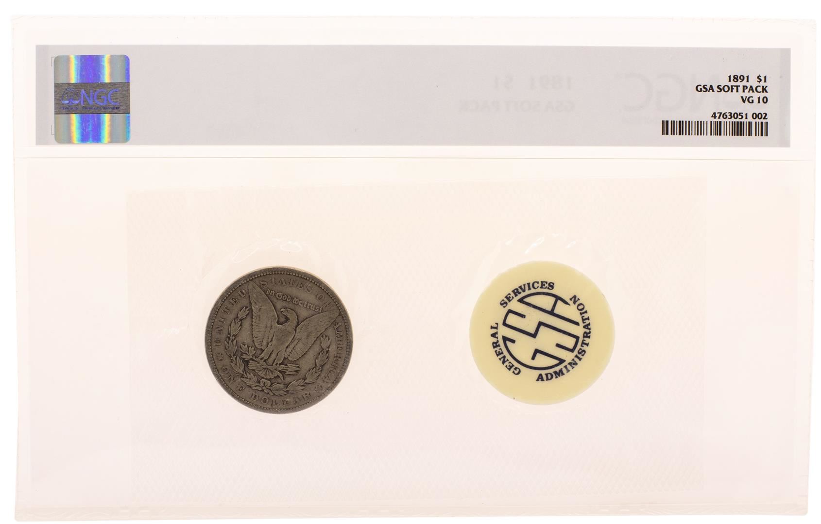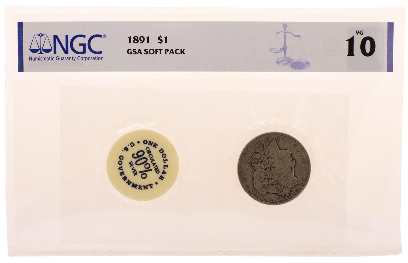 One 1891 $1 Morgan Silver Dollar Coin GSA Soft Pack NGC VG10. NGC Certified.