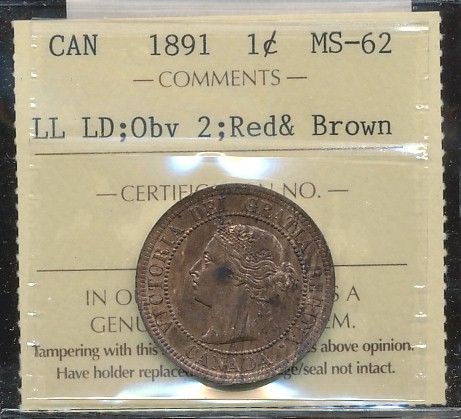 1891 1¢ Obv 2 LLLD ICCS MS62RB.
