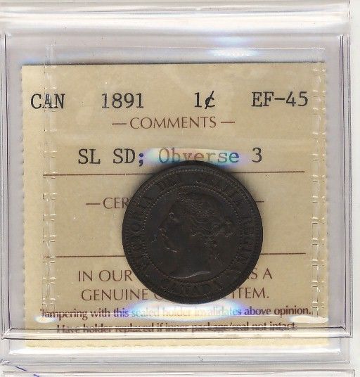 1891 1¢ Obv 3 SDSL ICCS EF45.