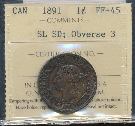 1891 1¢ Obv 3 SDSL ICCS EF45.