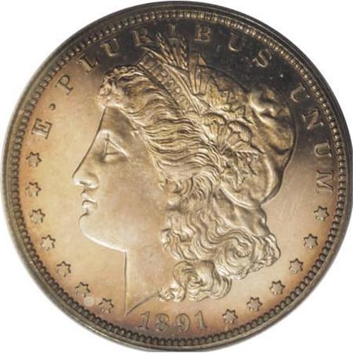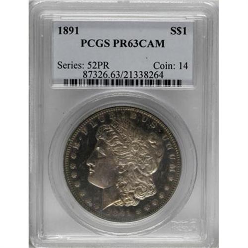 <B>1891 $1 PR63 Cameo PCGS.</B></I> Of the 1891 proof dollar, David Bowers (1993) writes that "The situation of flat-struck proof coins begun in 1888--coins with lightness of strike above Miss Liberty's ear ... and on the eagle's breast feathers ... was continued." The Select Cameo piece offered in this lot is sharply delineated, including relatively strong definition in Liberty's hair and the breast feathers. The cameo contrast is delightful, and whispers of lavender, cobalt-blue, and golden-tan make occasional visits to the border areas. Close examination reveals no mentionable abrasions, but some unobtrusive wispy hairlines are intermixed with die polish lines. All in all, a nice piece for the grade designation. Population: 9 in 63 Cameo, 28 finer (6/07).<BR><BR><b>Shipping:</b> Coins & Currency (<a target="_blank" href="http://www.heritageauctions.com/common/shipping.php">view shipping information</a>\)