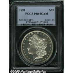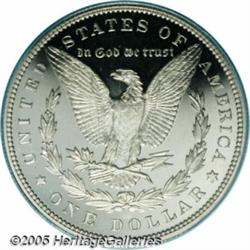 <B>1891<img border='0' src='http://www.heritagecoins.com/images/star.gif' width=10 height=10>$1 PR64 Cameo PCGS.</B></I> This Choice Proof is entirely brilliant without toning on either side. The obverse has light cameo contrast, just enough for the Cameo designation, while the reverse has much deeper contrast with deeply mirrored fields and lustrous devices.