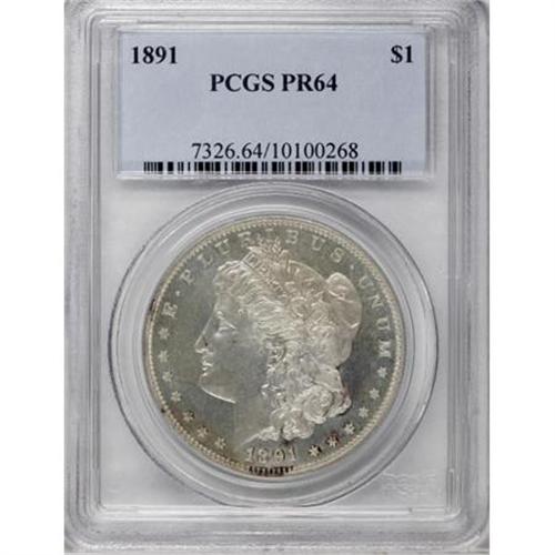 <B>1891 $1 PR64 PCGS.</B></I> There is much field-device contrast noted on this lovely near-Gem proof, although unmentioned on the PCGS encapsulation. Both sides have mellowed to a deep silver-gold color, and only a couple of paper-thin slide marks, noted on the cheek of Liberty, apparently keep this piece from a finer grade. Population: 45 in 64, 43 finer (1/08).<BR><BR><B>Coin Engraver:</B> George T. Morgan<BR><BR><b>Shipping:</b> Coins & Currency (<a target="_blank" href="http://www.heritageauctions.com/common/shipping.php">view shipping information</a>)