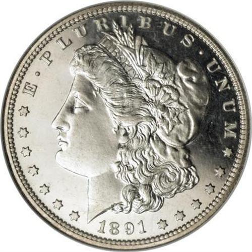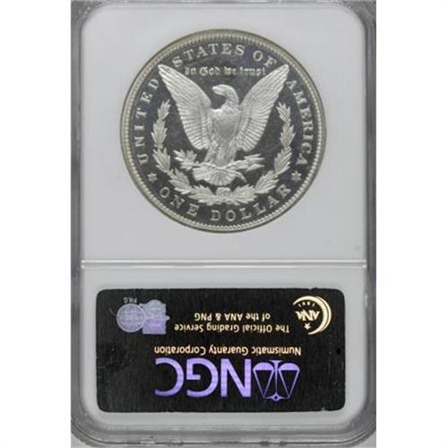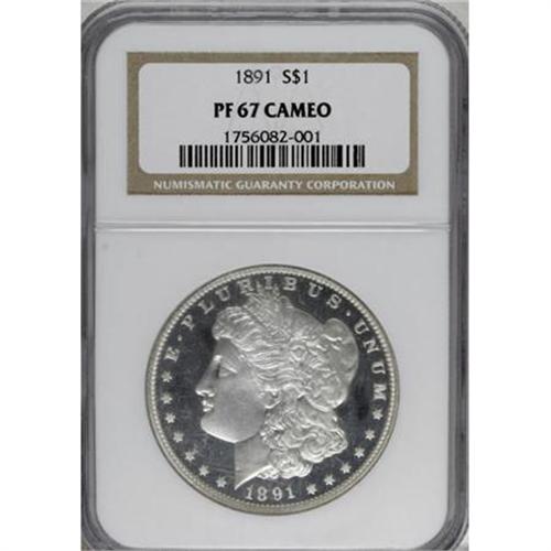 <B>1891 $1 PR67 Cameo NGC.</B></I> The technical aspects of this gleaming Gem specimen are impressive in their own right, but this coin's bold striking, often an area of deficiency on 1891 proof Morgans, sets this magnificent specimen apart. The delightfully frosted devices show wonderful definition, particularly at the often-soft hair over Liberty's ear. Hints of haze visit the fields, but the effect on the coin's contrast is minor.<BR> Q. David Bowers, in his <I>Guide Book of Morgan Silver Dollars</B></I>, sums up the proof 1891 issue: "Low mintage, the possibility of a weak strike, and so many cleaned and dipped coins on the market add up to a challenge." While the 650 proofs that comprise the 1891 issue come with a variety of potential pitfalls, this lovely exemplar bypasses those hazards. In sum, a specimen that merits careful consideration. Census: 12 in 67 Cameo, 2 finer (12/07).<BR><BR><b>Shipping:</b> Coins & Currency (<a target="_blank" href="http://www.heritageauctions.com/common/shipping.php">view shipping information</a>)