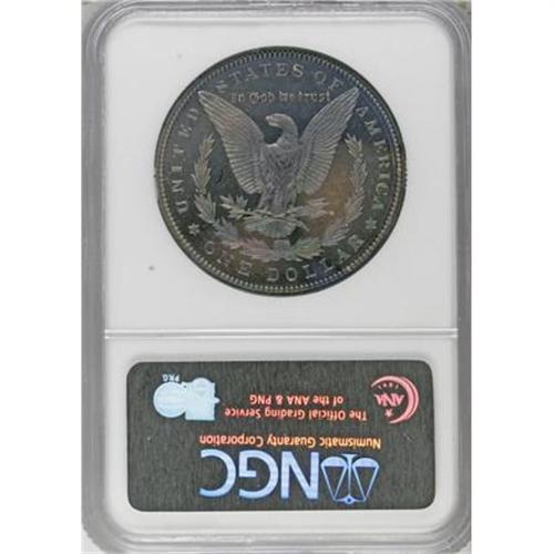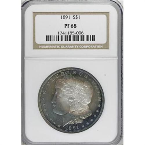 <B>1891 $1 PR68 NGC.</B></I> This piece should be designated Cameo due to the full contrast that is visible on each side. However, most of the obverse and all of the reverse are thickly toned in steel, heather, lilac, and sea-green, and this toning prevents such a designation. The obverse has a small circular area near the center that is brilliant white. It is an excellent example for the advanced collector assembling a set of proof Morgans, the collector putting together an 1891 proof set, or the collector of high quality type coins.<BR> NGC has certified five 1891 dollars at the PR68 level, two without any designation, two others as Cameo (one is a PR68<img border='0' src='http://www.heritagecoins.com/images/star.gif' width=10 height=10> Cameo), and one as Ultra Cameo. No examples have been called PR69 (6/07).<BR><BR><b>Shipping:</b> Coins & Currency (<a target="_blank" href="http://www.heritageauctions.com/common/shipping.php">view shipping information</a>)