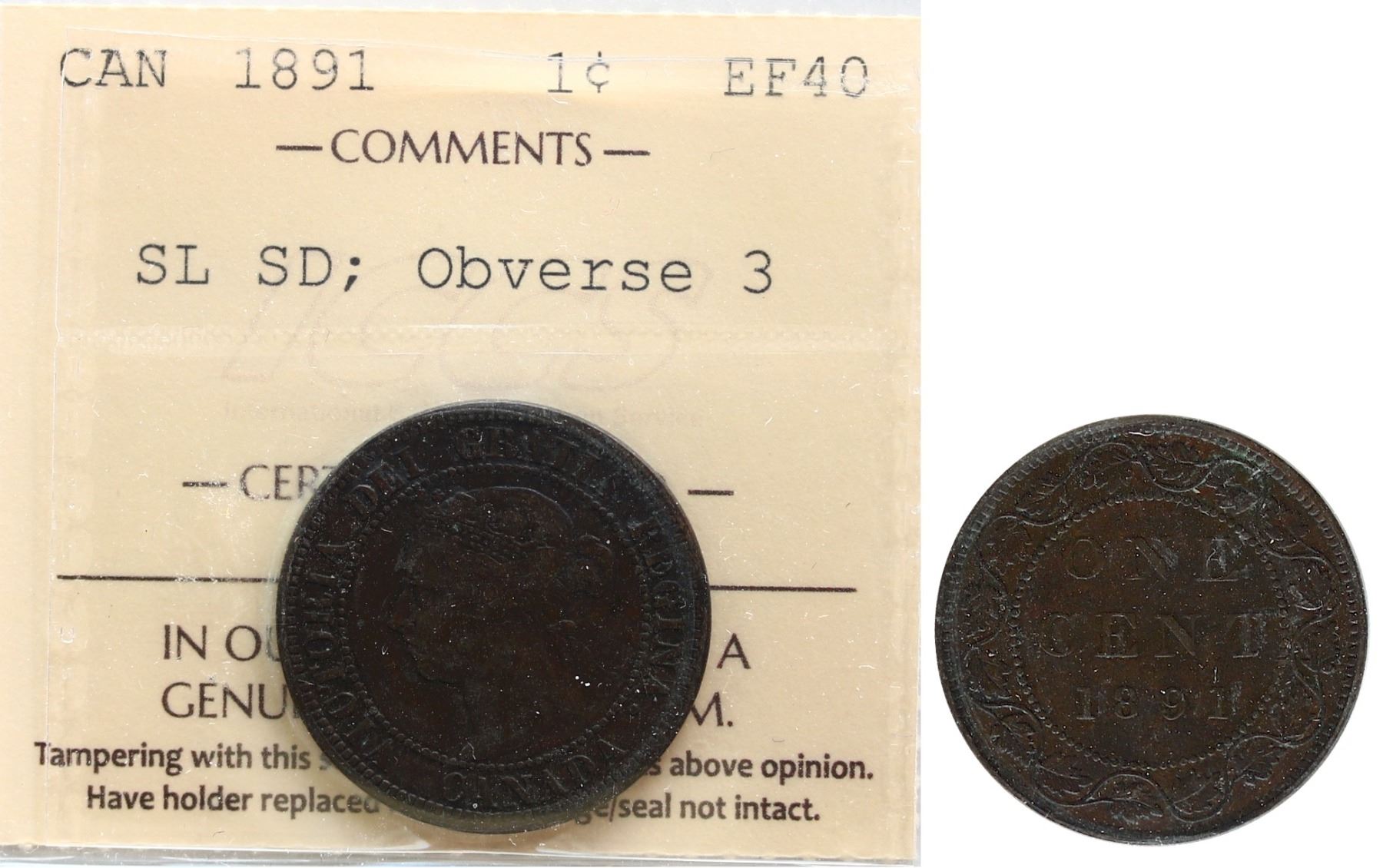 1891 1¢ "SD SL Obv.3" ICCS Extra Fine-40