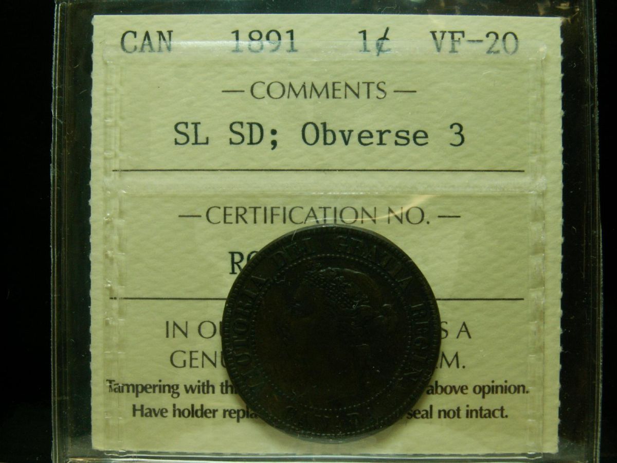 1891 1¢ SDSL Obv 3 ICCS VF20
