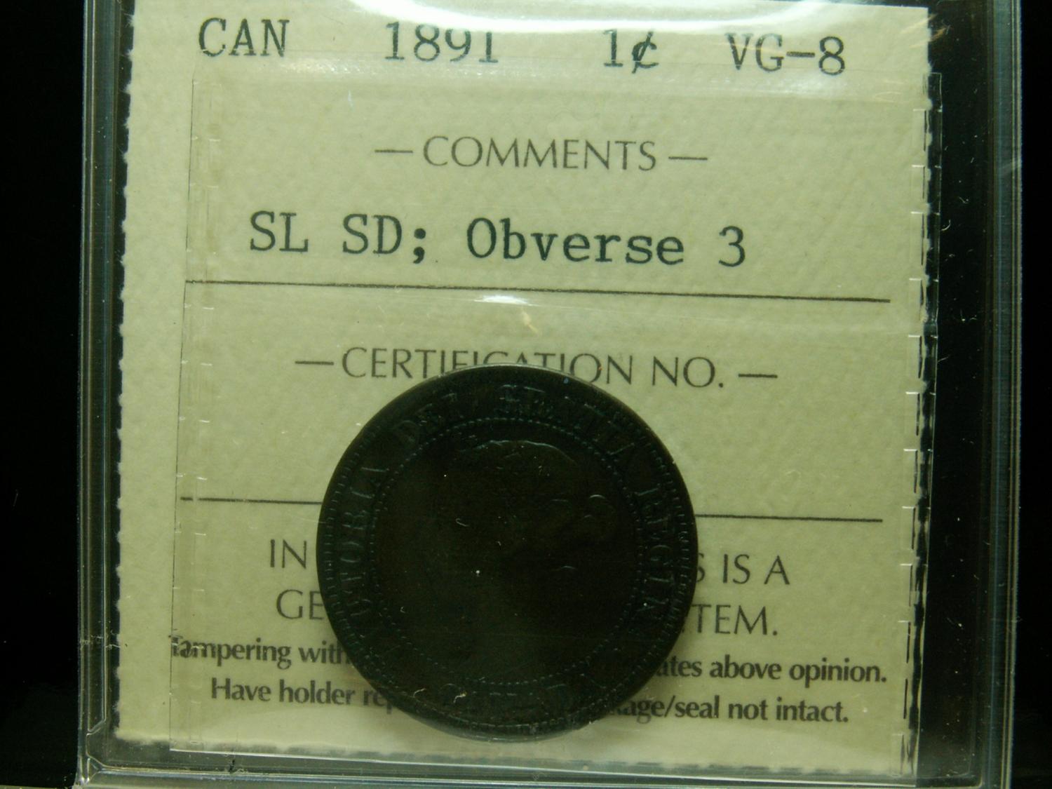 1891 1¢ SDSL Obv 3 ICCS VG8