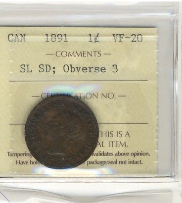 1891 1¢ SL SD Obv 3 ICCS VF20.