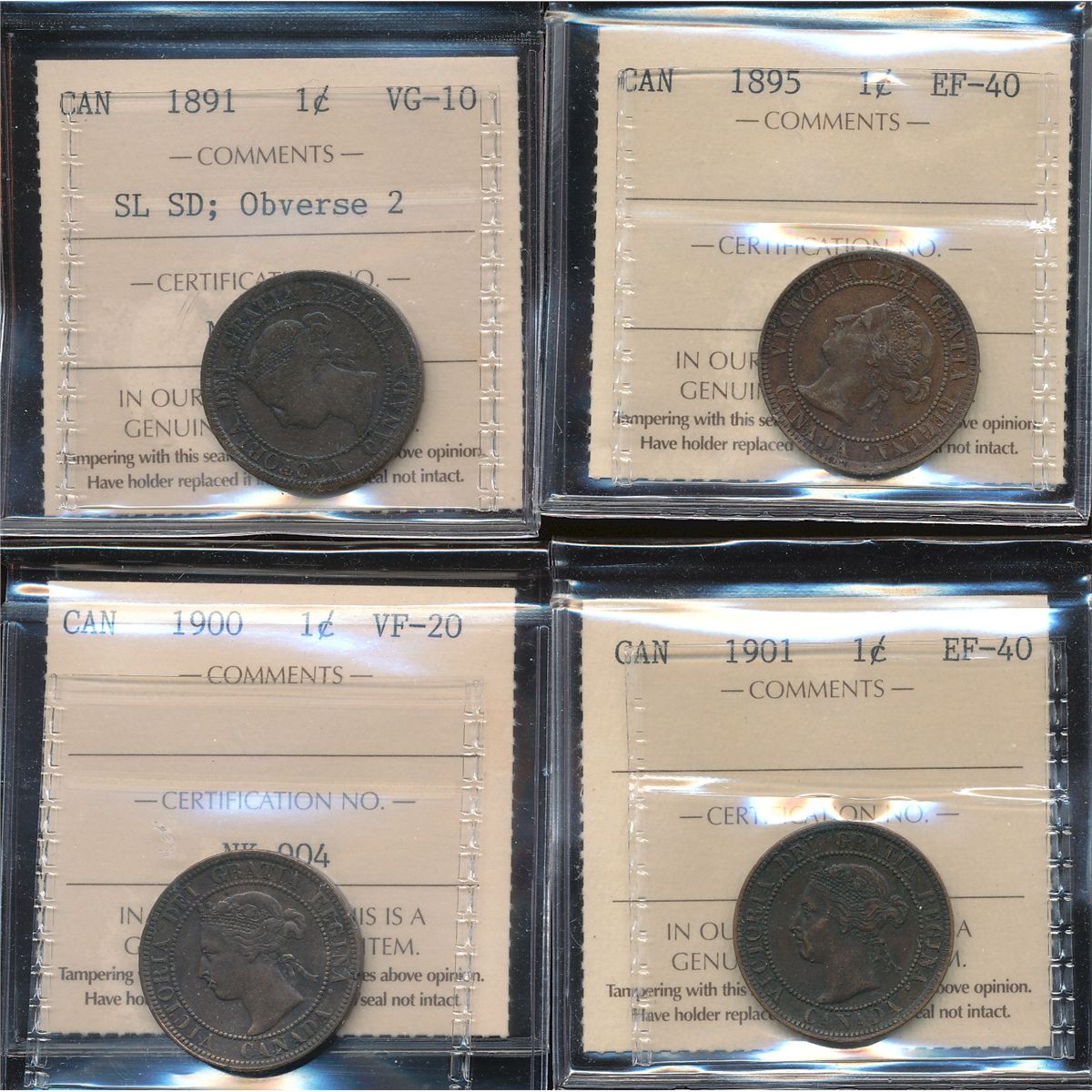 1891 1¢ SLSD Obv 2 VG10, 1895 EF40, 1900 VF20 & 1901 EF40. Lot of 4 ICCS Coins.