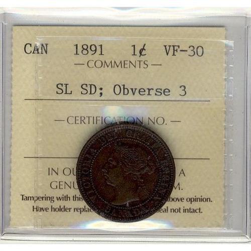 1891 1¢ SLSD Obv 3 ICCS VF30.