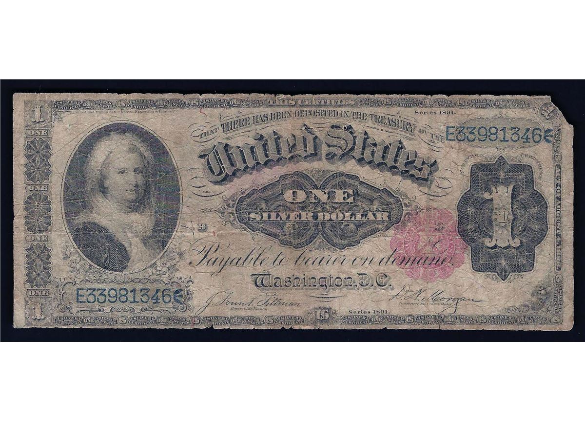 One 1891 $1 Silver Certificate Martha Washington Note Fr. 223, this note does have some pinholes.