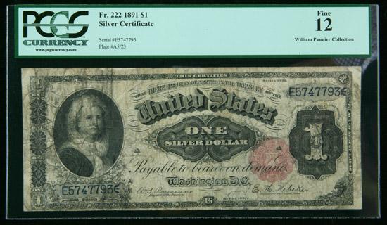1891, $1 Silver Certificate. PCGS Fine 12. . Fr-222. Pleasing for the grade, and although well circulated this Martha is quite a decent choice for the collector on a budget who just wants one in this price range.