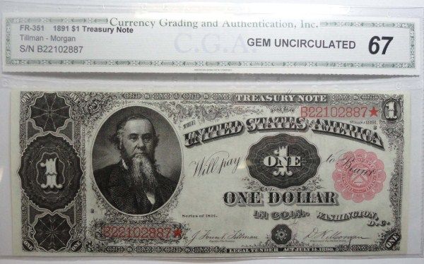 1891 $1 TREASURY NOTE CGA 67 SPECTACULAR