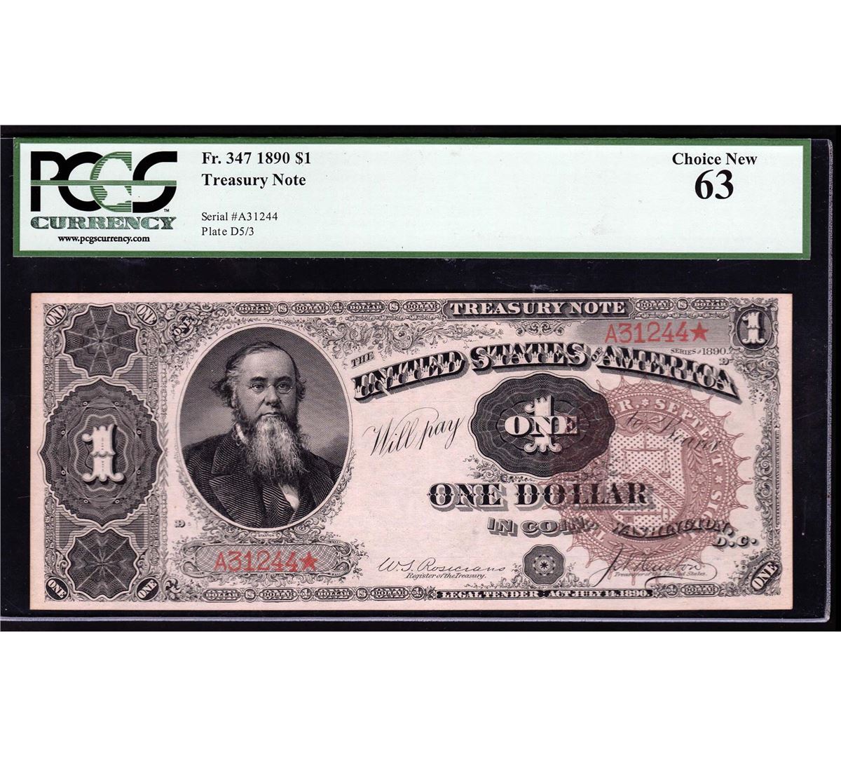 One 1891 $1 Treasury Coin Note PCGS Choice New 63. PCGS Graded.