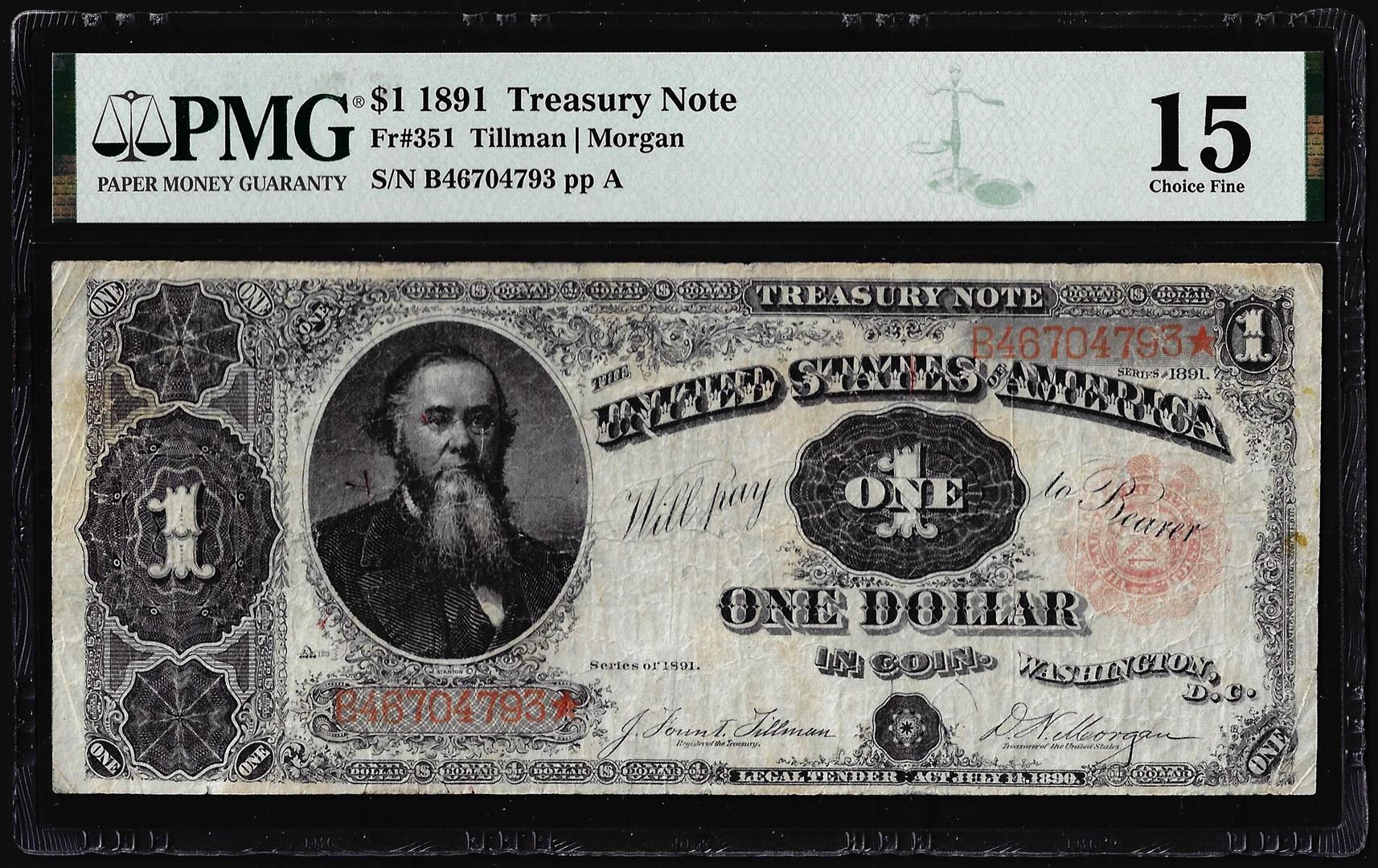 One 1891 $1 Treasury Note Fr.351 PMG Choice Fine 15. PMG Certified.