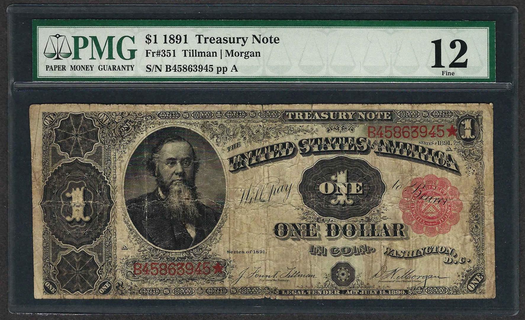 One 1891 $1 Treasury Note Fr.351 PMG Fine 12. PMG Certified.