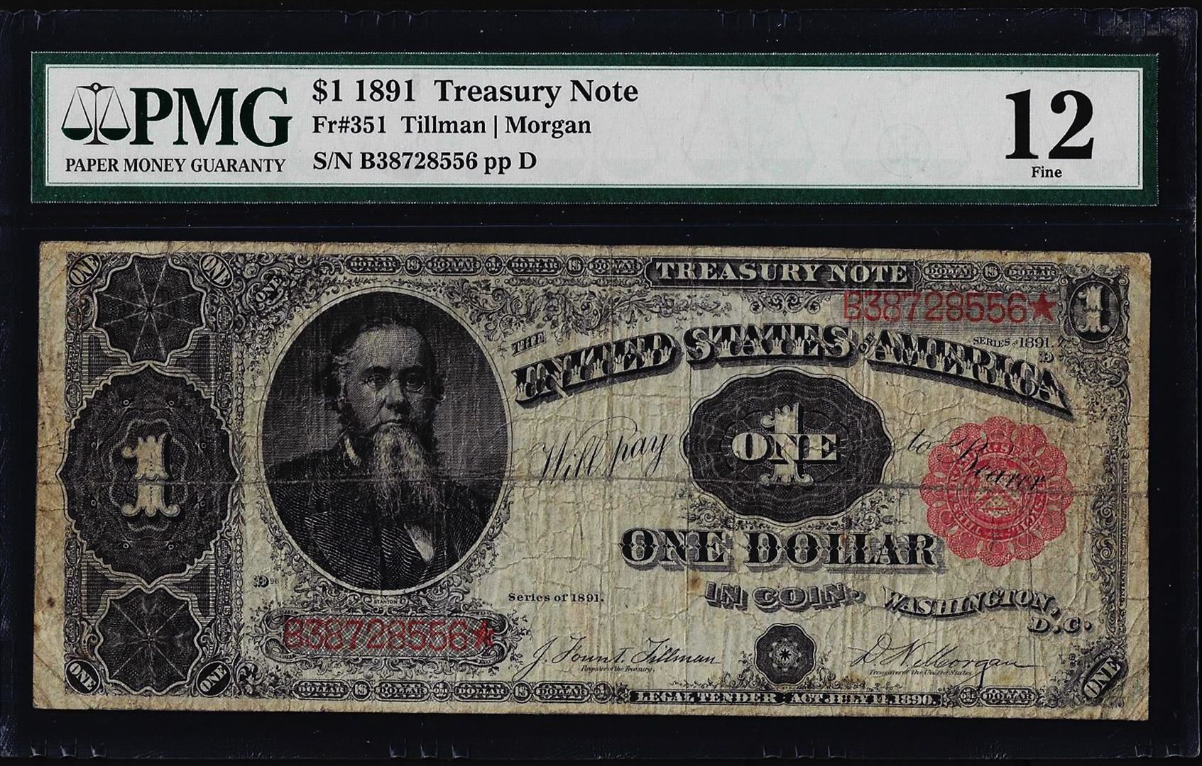 One 1891 $1 Treasury Note Fr.351 PMG Fine 12. PMG Certified.
