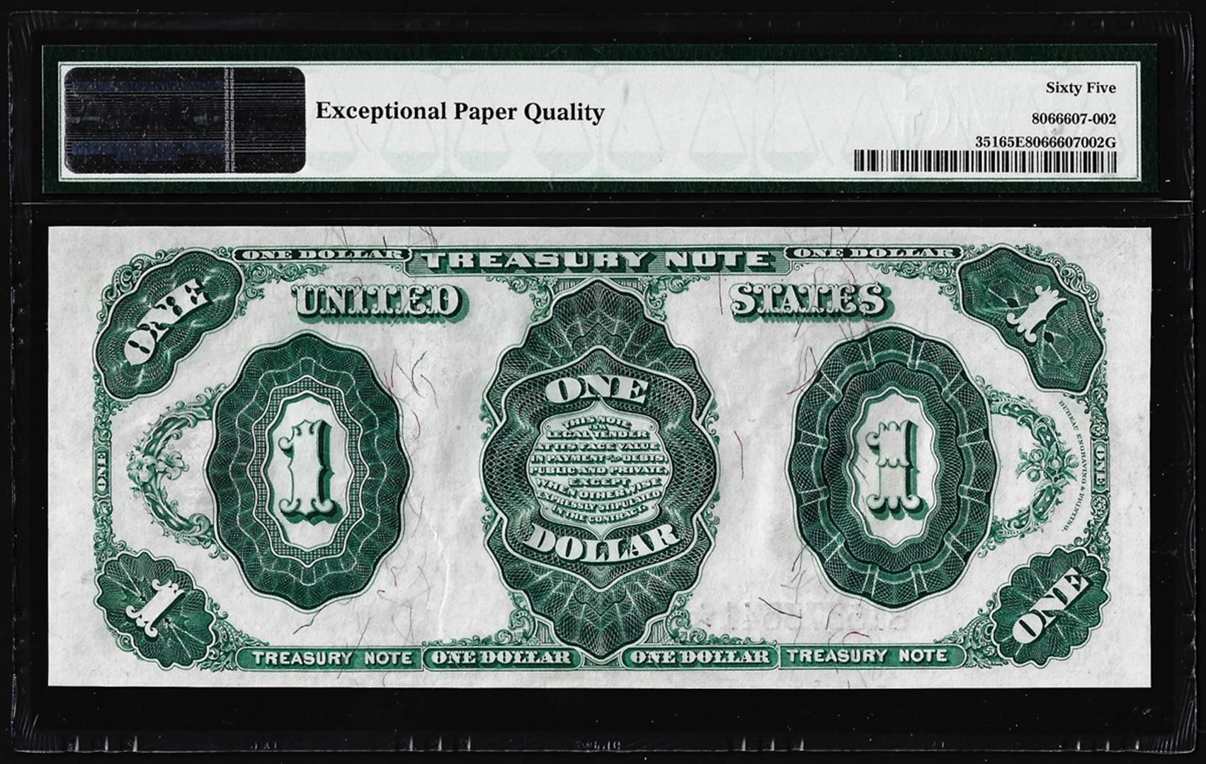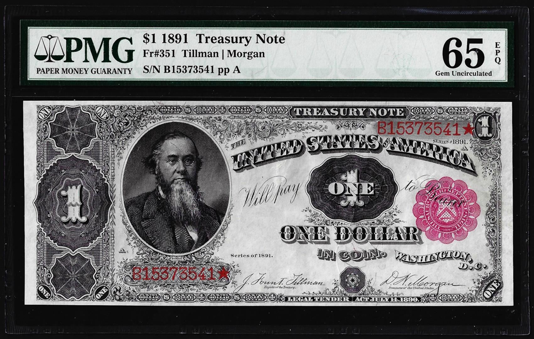 One 1891 $1 Treasury Note Fr.351 PMG Gem Uncirculated 65EPQ. PMG Certified.