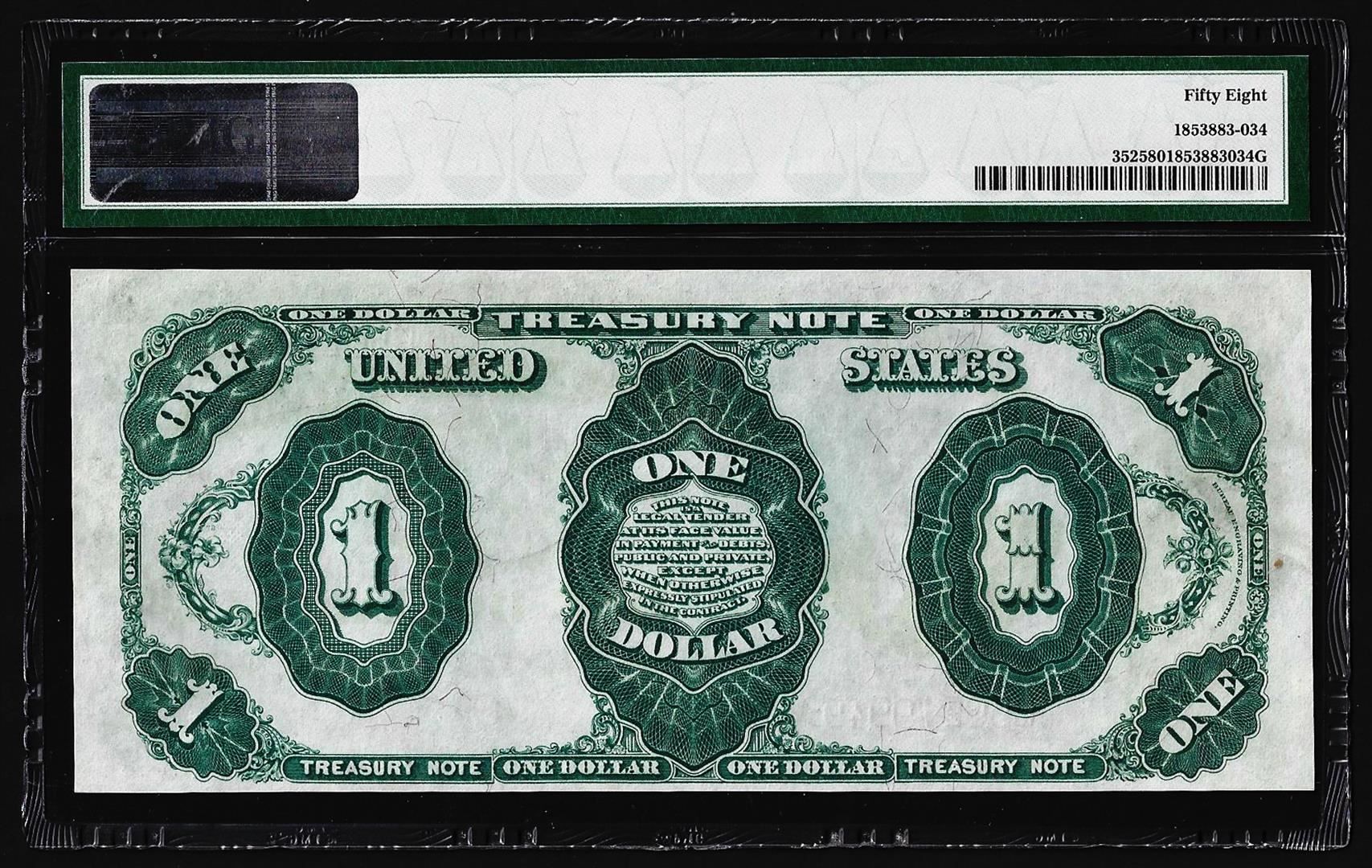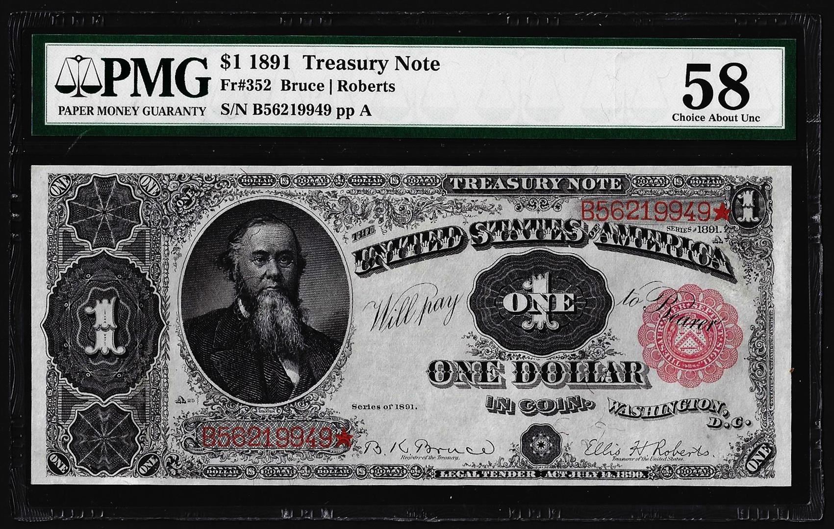 One 1891 $1 Treasury Note Fr.352 PMG Choice About Uncirculated 58. PMG Certified.