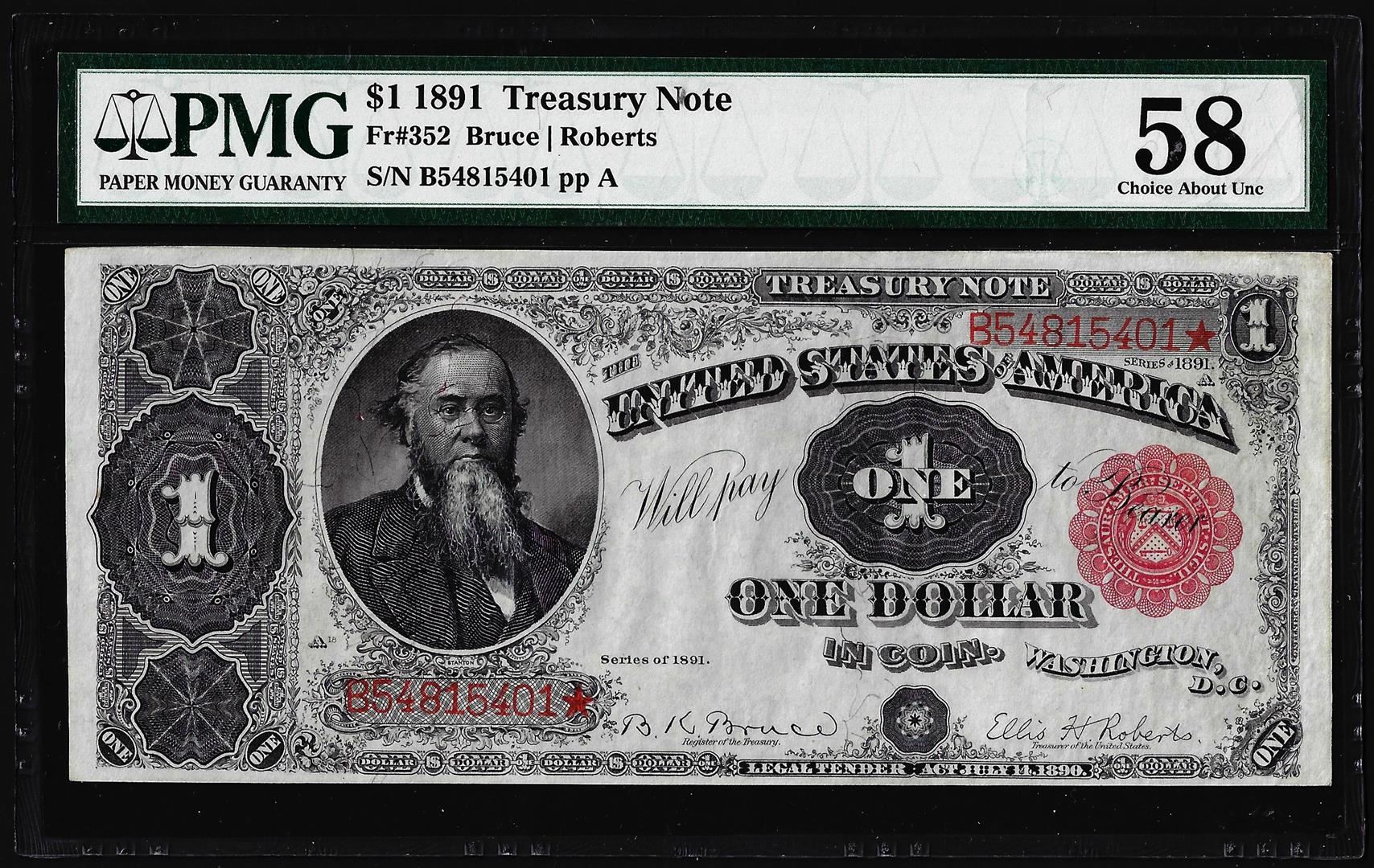 One 1891 $1 Treasury Note Fr.352 PMG Choice About Uncirculated 58. PMG Certified.