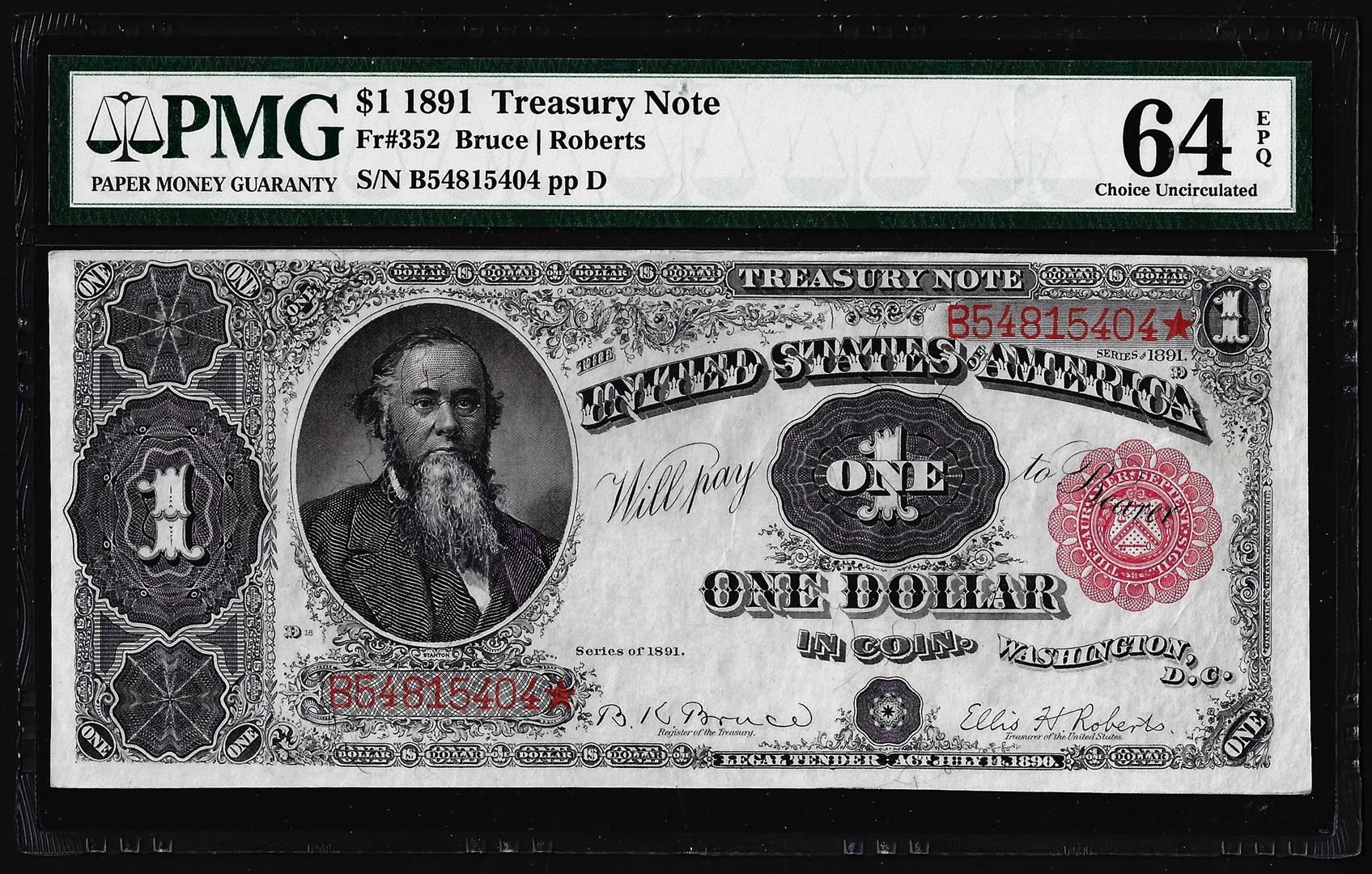 One 1891 $1 Treasury Note Fr.352 PMG Choice Uncirculated 64EPQ. PMG Certified.