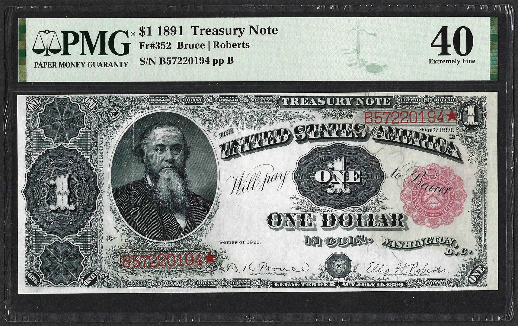 One 1891 $1 Treasury Note Fr.352 PMG Extremely Fine 40 . PMG Certified.