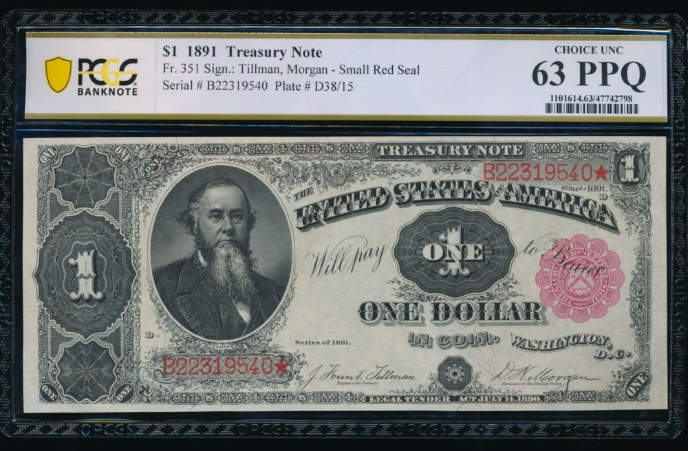 One 1891 $1 Treasury Note PCGS 63PPQ.