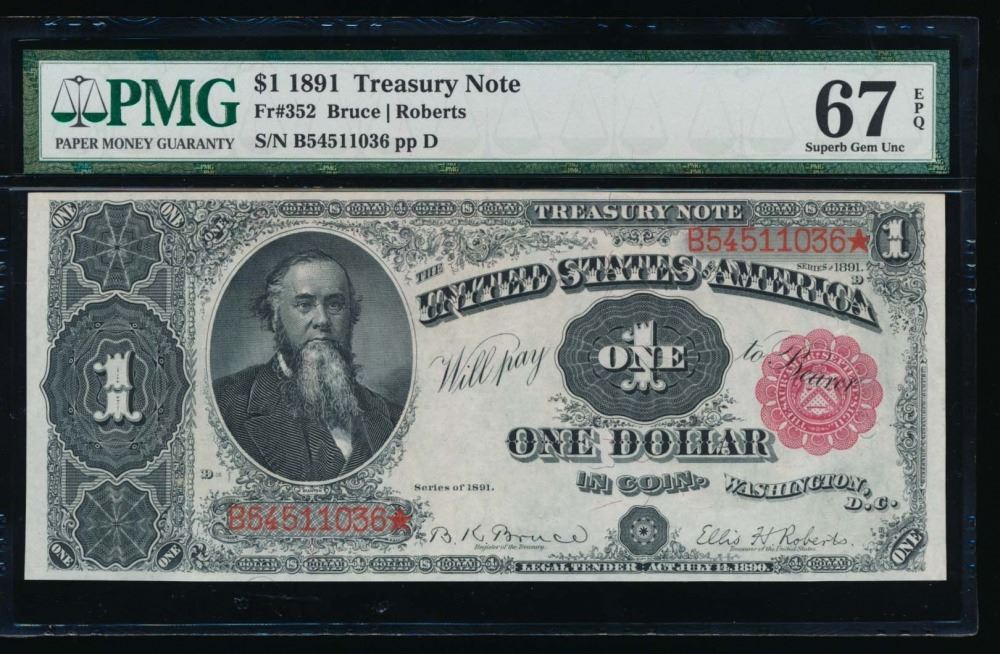 One 1891 $1 Treasury Note PMG 67EPQ.